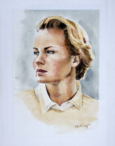 Portraitmalerei nach Foto in farbiger Aquarelltechnik auf Büttenpapier. Format DIN A3.